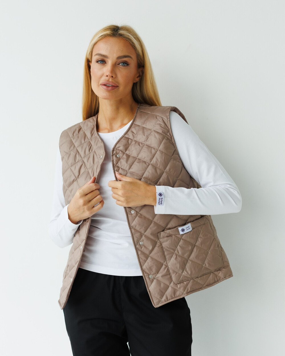 Стьобана жилетка вільного силуету, застібається на кнопки. Має округлу горловину, місткі кишені, зі сторони підкладки є вішак. Утеплена синтепоном.