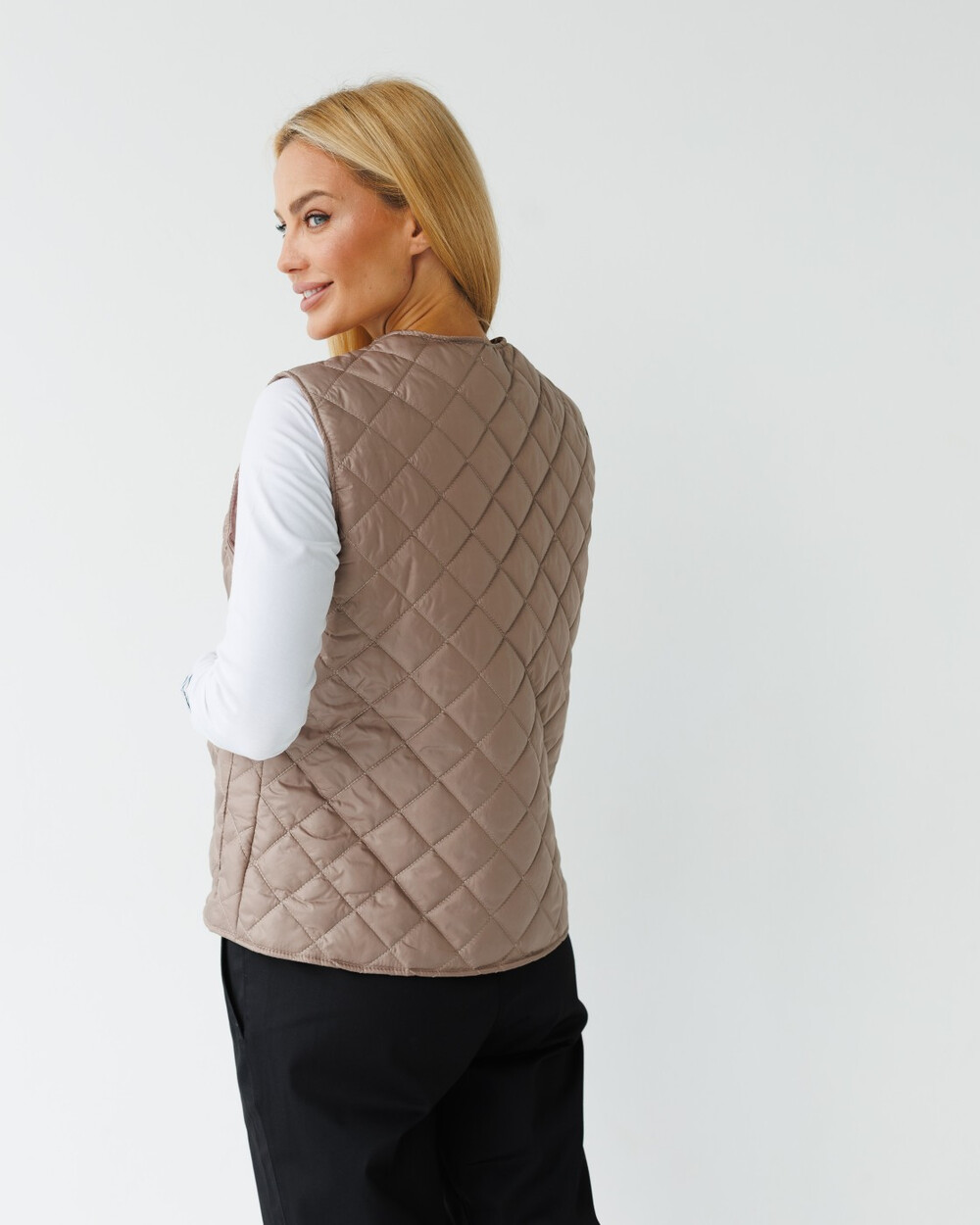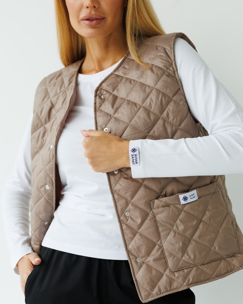 Стьобана жилетка вільного силуету, застібається на кнопки. Має округлу горловину, місткі кишені, зі сторони підкладки є вішак. Утеплена синтепоном.