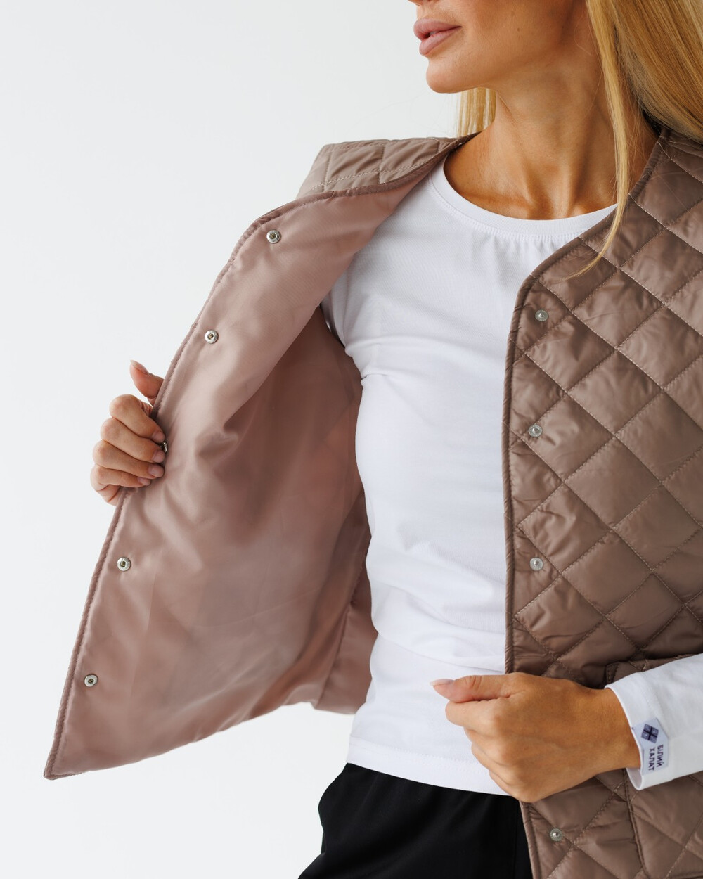 Стьобана жилетка вільного силуету, застібається на кнопки. Має округлу горловину, місткі кишені, зі сторони підкладки є вішак. Утеплена синтепоном.