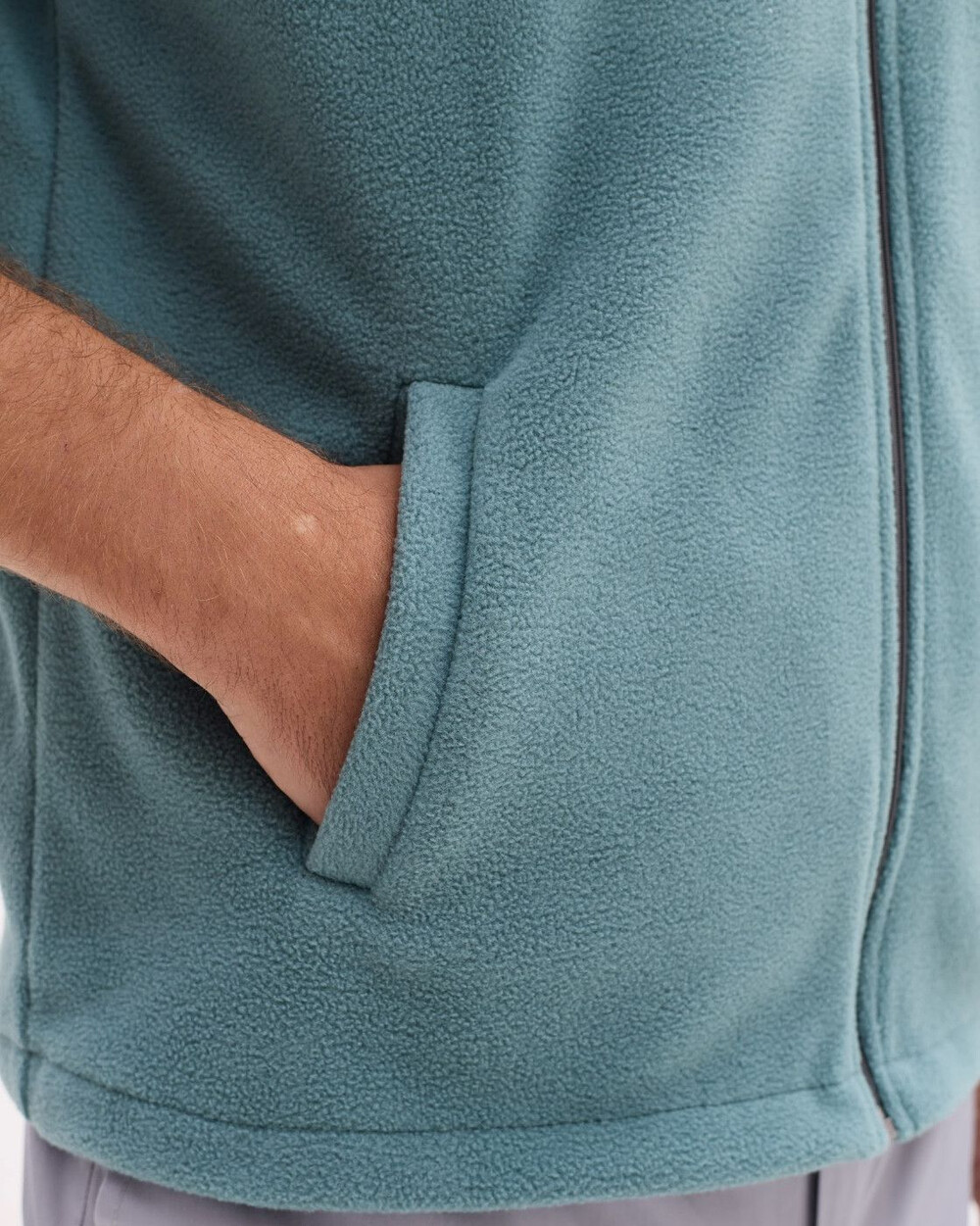 Жилетка прямого силуету з коміром-стійкою, застібка — блискавка. Є дві місткі кишені та нагрудна накладна кишеня. Низ жилетки можна стягувати шнуром-резинкою з фіксаторами. Виготовлена зі спеціалізованого двостороннього флісу, який краще зберігає тепло та абсолютно невибагливий у догляді.