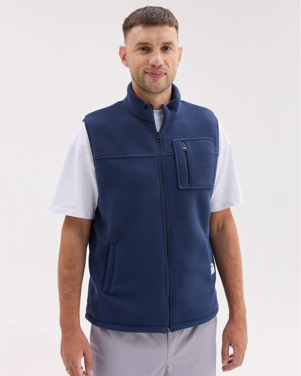 Жилетка прямого силуету з коміром-стійкою, застібка — блискавка. Є дві місткі кишені та нагрудна накладна кишеня. Низ жилетки можна стягувати шнуром-резинкою з фіксаторами. Виготовлена зі спеціалізованого двостороннього флісу, який краще зберігає тепло та абсолютно невибагливий у догляді.