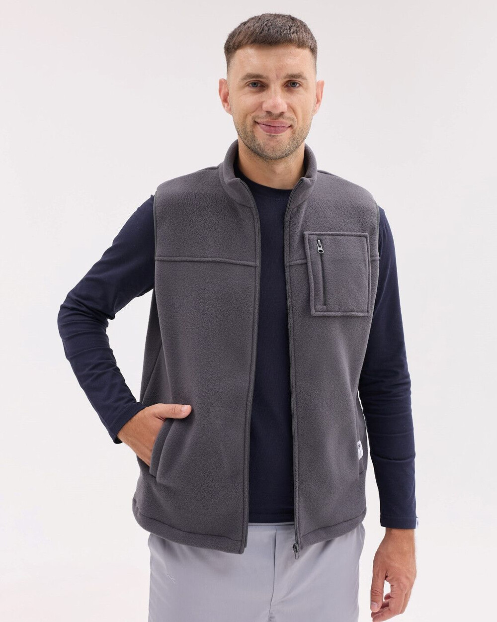 Жилетка прямого силуету з коміром-стійкою, застібка — блискавка. Є дві місткі кишені та нагрудна накладна кишеня. Низ жилетки можна стягувати шнуром-резинкою з фіксаторами. Виготовлена зі спеціалізованого двостороннього флісу, який краще зберігає тепло та абсолютно невибагливий у догляді.