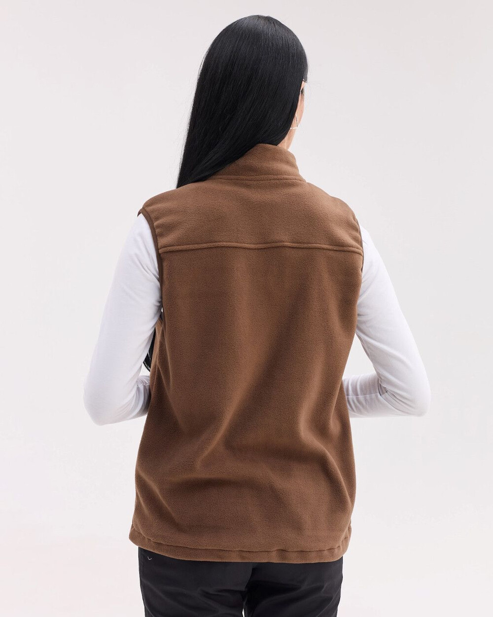 Жилетка прямого силуету з коміром-стійкою, застібка — блискавка. Є дві місткі кишені та нагрудна накладна кишеня. Низ жилетки можна стягувати шнуром-резинкою з фіксаторами. Виготовлена зі спеціалізованого двостороннього флісу, який краще зберігає тепло та абсолютно невибагливий у догляді.