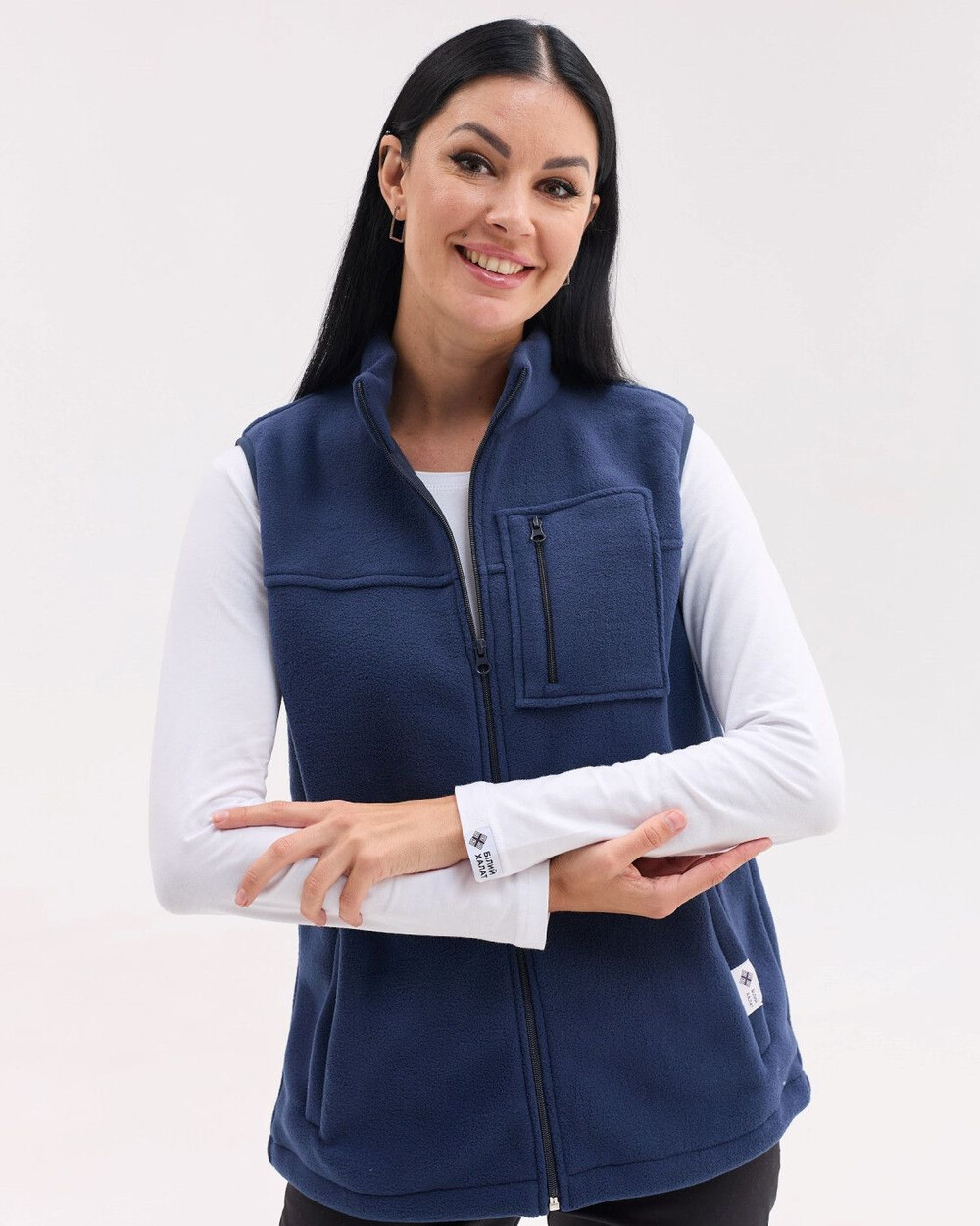 Жилетка прямого силуету з коміром-стійкою, застібка — блискавка. Є дві місткі кишені та нагрудна накладна кишеня. Низ жилетки можна стягувати шнуром-резинкою з фіксаторами. Виготовлена зі спеціалізованого двостороннього флісу, який краще зберігає тепло та абсолютно невибагливий у догляді.