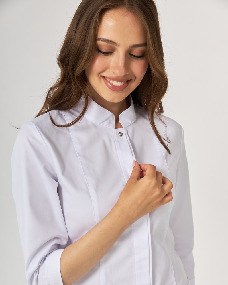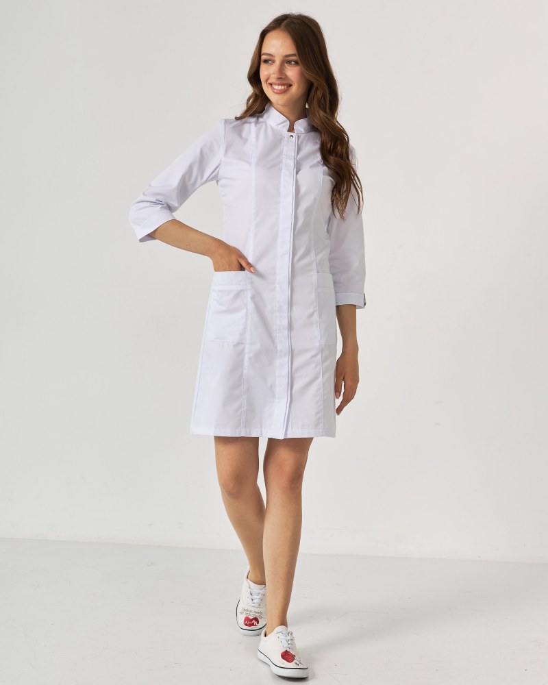 Гарні медичні халати Сакура обирають для себе і лікарі, і майстри краси. Напівприталений фасон, зручна довжина рукава, комір-стійка додають образу стриманості та елегантності.