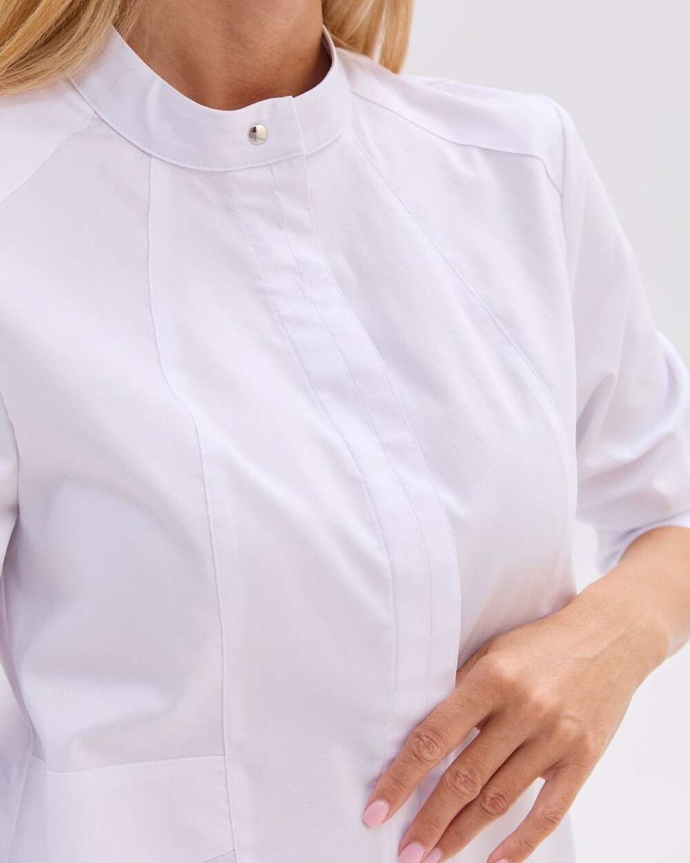 Жіночий халат напівприталеного силуету з рукавами 3/4, з комірцем-стійкою, застібається на приховані кнопки, декорований вертикальними рельєфами з оздоблювальною строчкою. Халат має накладні кишені.