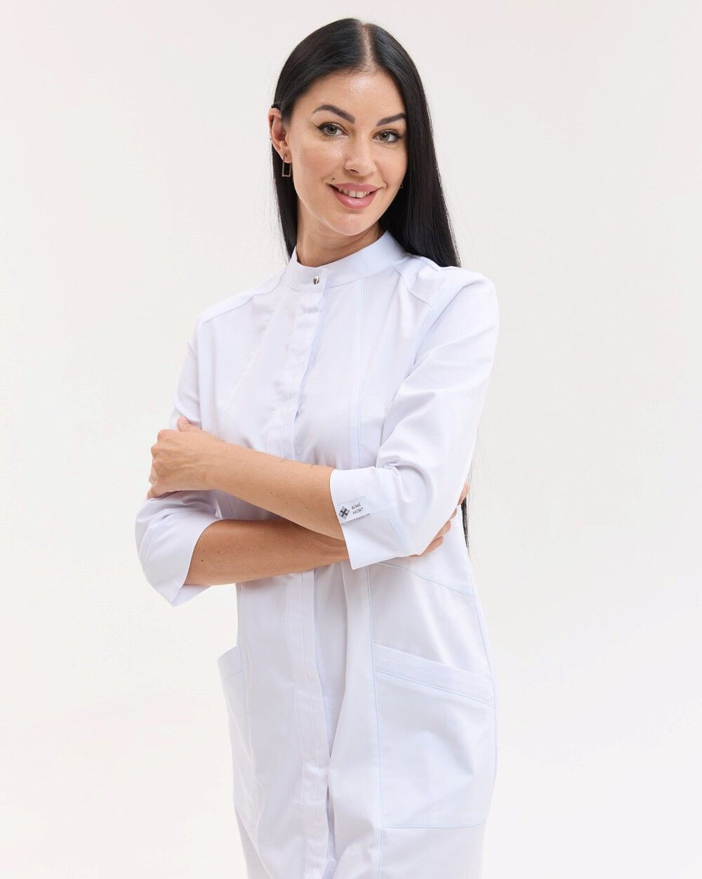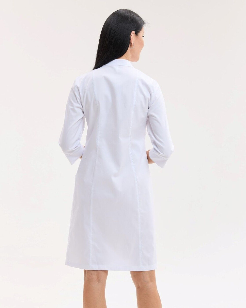 Жіночий халат напівприталеного силуету з рукавами 3/4, з комірцем-стійкою, застібається на приховані кнопки, декорований вертикальними рельєфами з оздоблювальною строчкою. Халат має накладні кишені.
