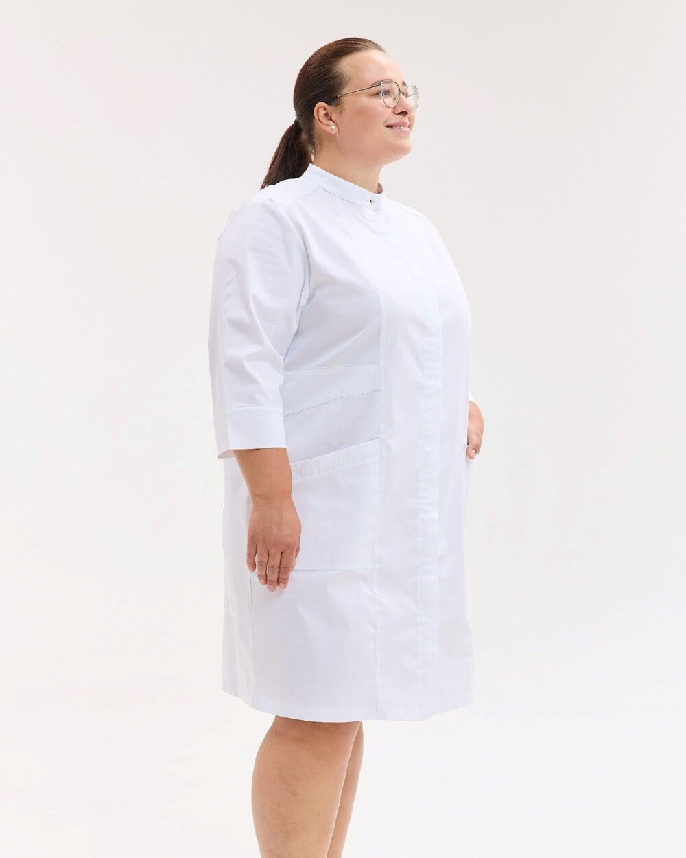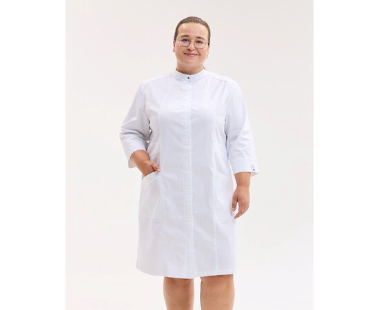 Жіночий халат напівприталеного силуету з рукавами 3/4, з комірцем-стійкою, застібається на приховані кнопки, декорований вертикальними рельєфами з оздоблювальною строчкою. Халат має накладні кишені.