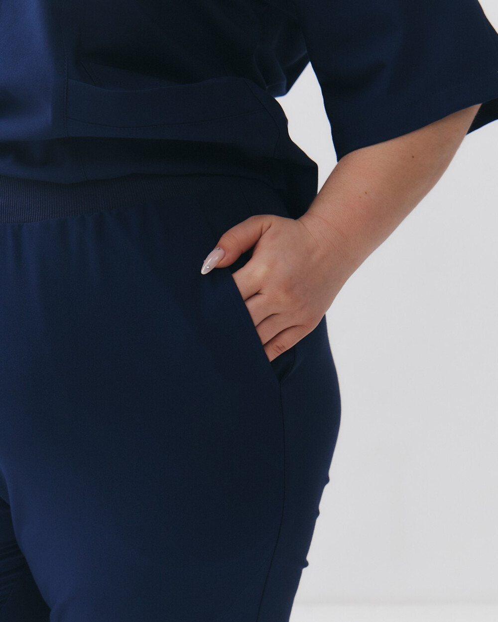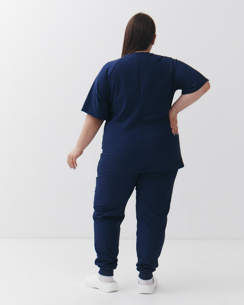 V-подібний виріз сорочки, джоггери на зручній гумці із зав'язками, зручна довжина виробів. Важлива з переваг — еластична тканина преміум сегмента, яка не меніться і тягнеться на всі боки.