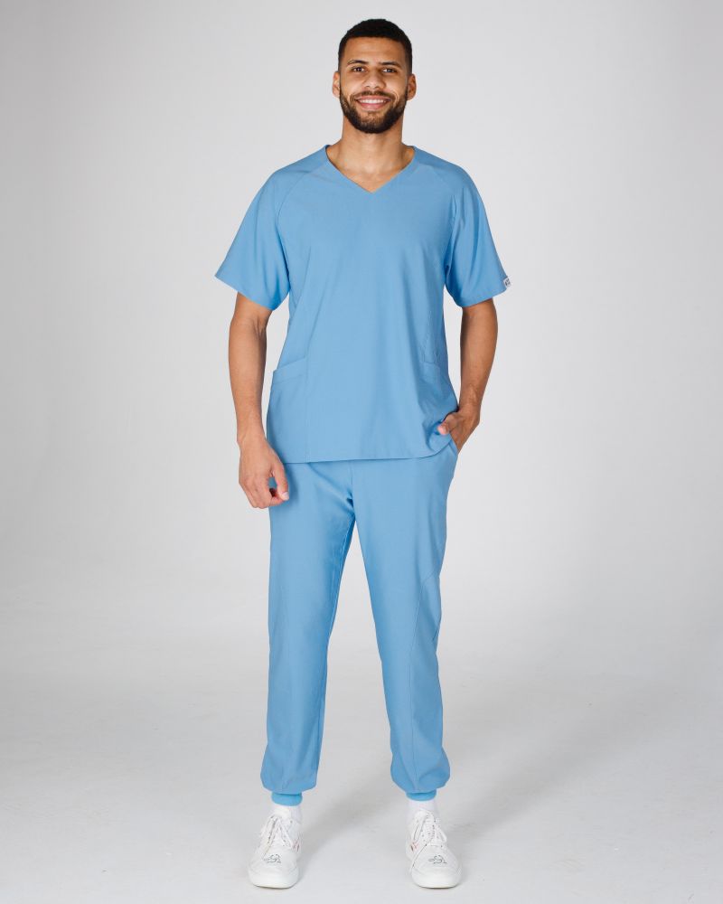 Медичний чоловічий костюм Арізона має V-подібний виріз сорочки. Джогери на зручній резинці із зав'язками, зручна довжина виробів. Важлива з переваг - еластична тканина преміум сегмента, яка не мнеться і тягнеться на всі боки.