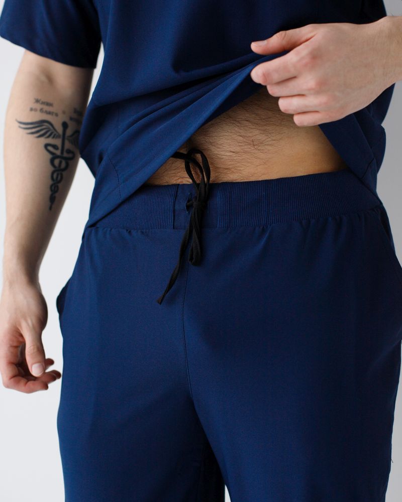 Медичний чоловічий костюм Арізона має V-подібний виріз сорочки. Джогери на зручній резинці із зав'язками, зручна довжина виробів. Важлива з переваг - еластична тканина преміум сегмента, яка не мнеться і тягнеться на всі боки.