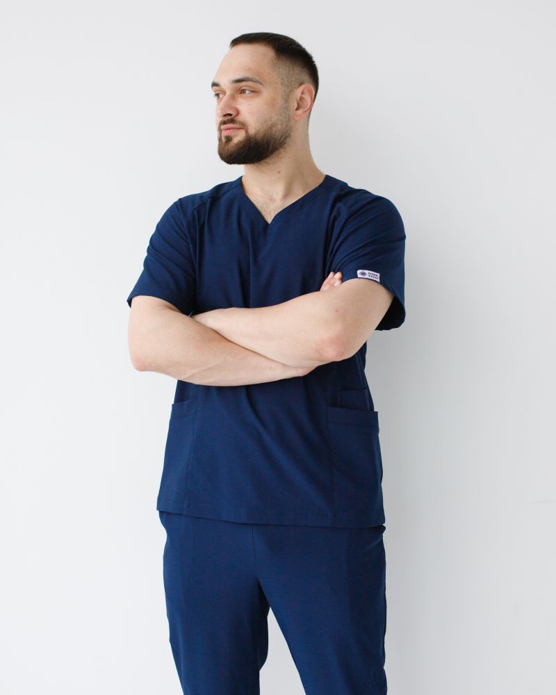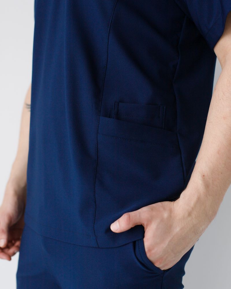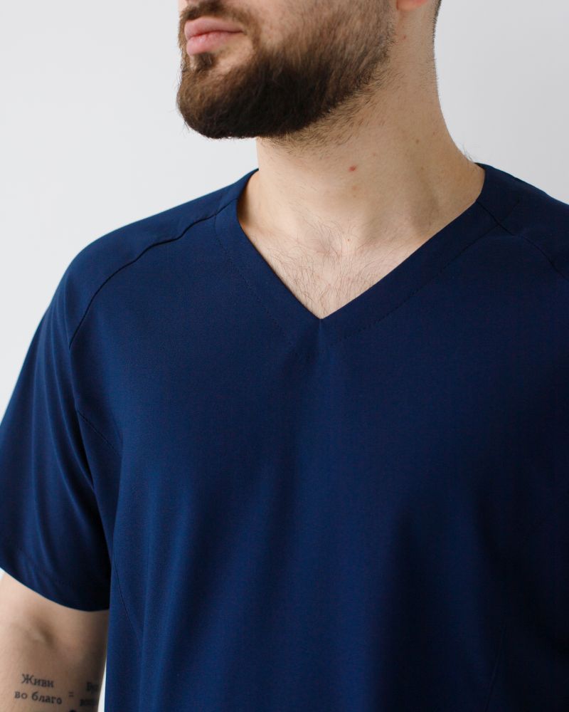 Медичний чоловічий костюм Арізона має V-подібний виріз сорочки. Джогери на зручній резинці із зав'язками, зручна довжина виробів. Важлива з переваг - еластична тканина преміум сегмента, яка не мнеться і тягнеться на всі боки.