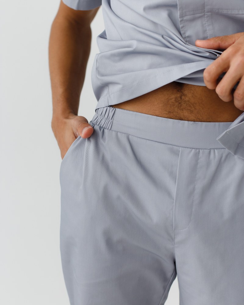 Медичний костюм чоловічий Бостон складається з сорочки на кнопках та штанів. Силует сорочки - прямий, короткий рукав, втачной. Комір-стійка та вшивна планка з фігурними швами додають образу ексклюзивності. Бічні шви з обробленими розрізами роблять медичну сорочку максимально комфортною для будь-якого виду діяльності. Штани - прямі, звужені донизу, з гумкою в області талії. Є глибокі втачні кишені.