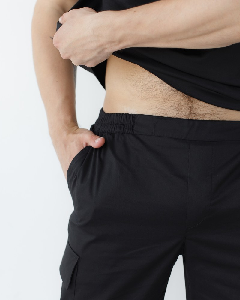 Штани медичного костюма чоловічого DENVER (Денвер) заслуговують на особливу увагу. Фасон карго для медичної чоловічої уніформи – це сміливе та практичне рішення. Штани карго, злегка звужені до низу, дозволяють активно рухатися протягом тривалих робочих змін. Середня висота посадки та вшита широка еластична гумка не сковує рухів, не передавлює. Декоративний гульфік на лицьовій стороні медичних штанів чоловічих костюмів DENVER (Денвер) додає образу стриманості. Штани доповнені чотирма місткими кишенями: дві втачні вище, під еластичною гумкою, і дві накладні нижче лінії стегна. Накладні кишені закриваються клапаном.