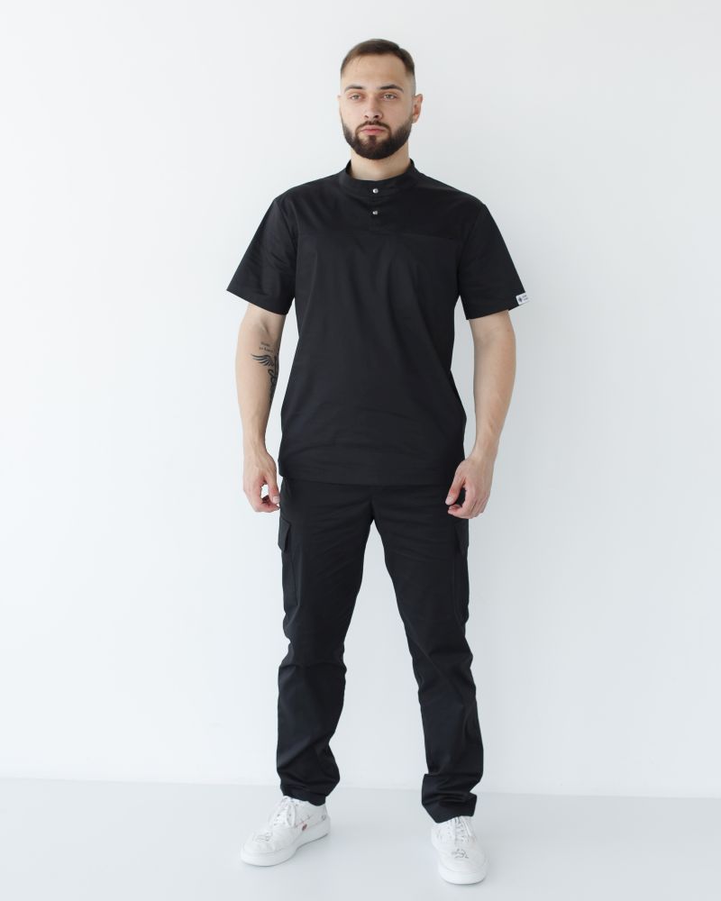 Чоловічий костюм-двійка складається з медичної сорочки з коротким рукавом і брюк-карго. Сорочка має прямий силует, доповнений короткими рукавами, декорований лівий брендованою нашивкою. Комір-стійка та неглибокий розріз горловини застібається на дві кнопки. На лицьовому боці розташувався декоративний шов, у якому захована функціональна кишеня.
