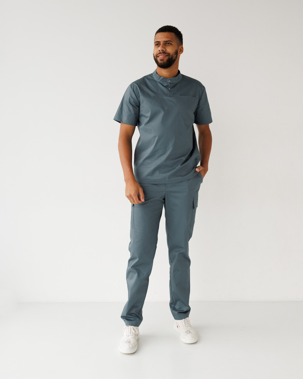 Мед костюм чоловічий DENVER (Денвер) - це зручний чоловічий костюм-двійка, який складається з медичної сорочки з коротким рукавом і брюк-карго. Сорочка має прямий силует, доповнений короткими рукавами, декорований лівий брендованою нашивкою. Комір-стійка та неглибокий розріз горловини застібається на дві кнопки. На лицьовій стороні розташувався декоративний шов, у якому захована функціональна кишеня.