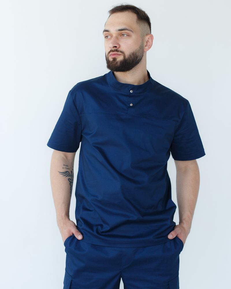 Чоловічий костюм-двійка складається з медичної сорочки з коротким рукавом і брюк-карго. Сорочка має прямий силует, доповнений короткими рукавами, декорований лівий брендованою нашивкою. Комір-стійка та неглибокий розріз горловини застібається на дві кнопки. На лицьовому боці розташувався декоративний шов, у якому захована функціональна кишеня.