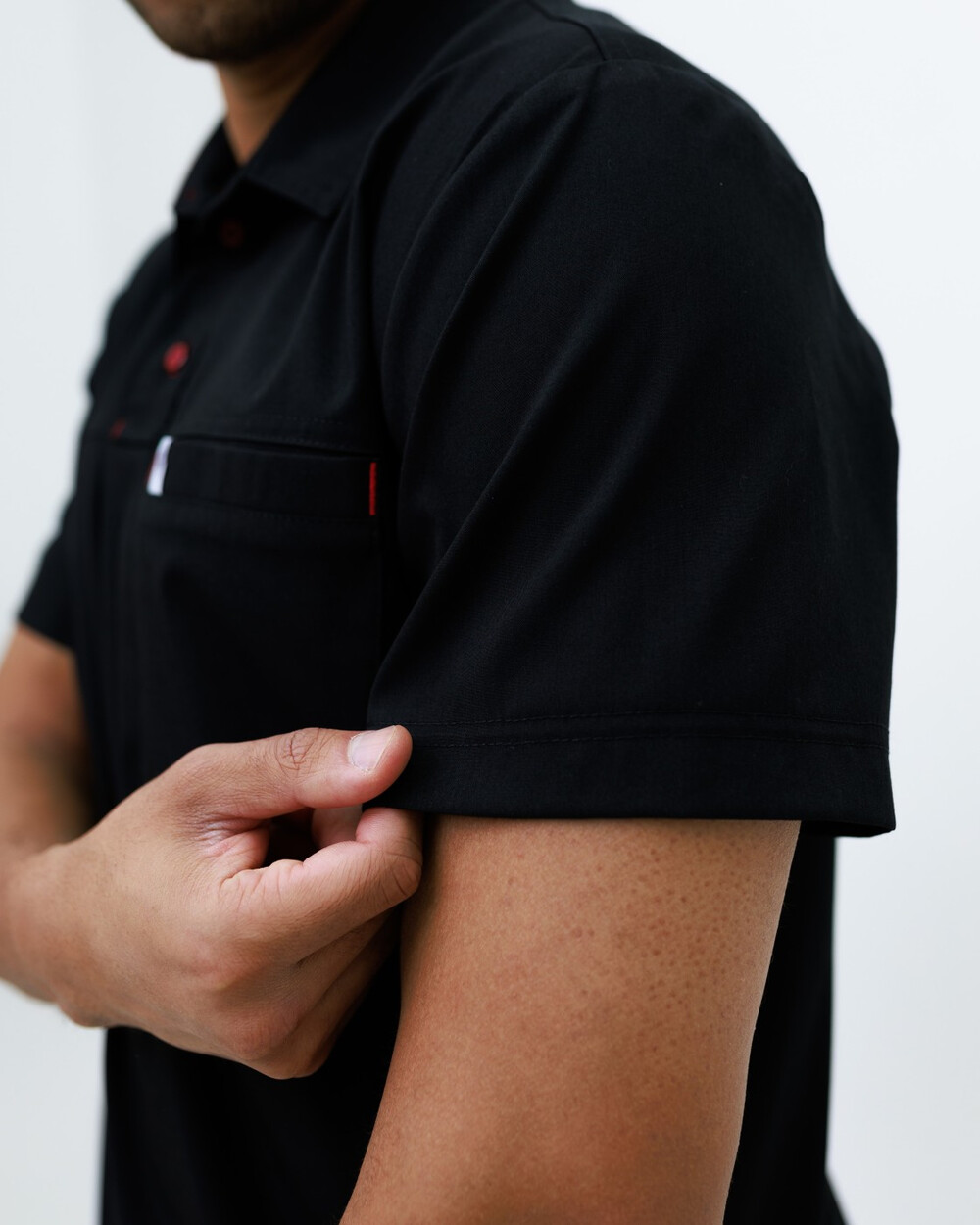 Чоловічий костюм вільного силуету. Сорочка з класичним комірцем на стійці із застібкою поло. На сорочці з лівого боку є накладна зашита кишеня, після прання вона стає функціональною. Рукави – короткі.