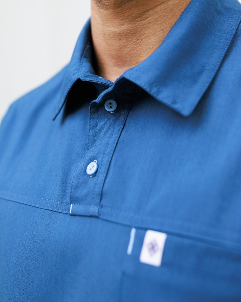 Чоловічий костюм вільного силуету. Сорочка з класичним комірцем на стійці із застібкою поло. На сорочці з лівого боку є накладна зашита кишеня, після прання вона стає функціональною. Рукави – короткі.