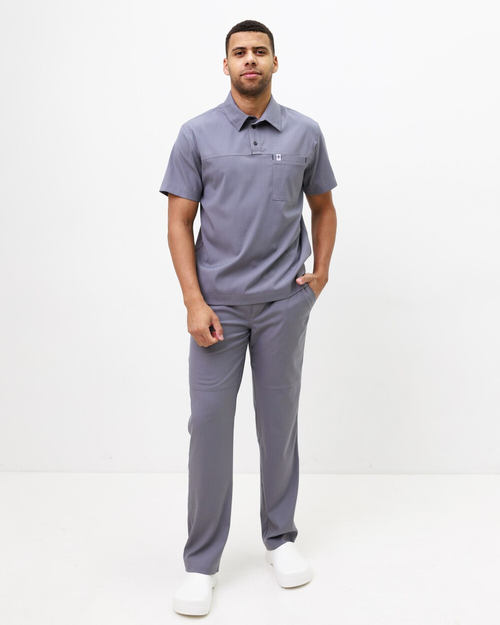 Чоловічий костюм вільного силуету. Сорочка з класичним комірцем на стійці із застібкою поло. На сорочці з лівого боку є накладна зашита кишеня, після прання вона стає функціональною. Рукави – короткі.
