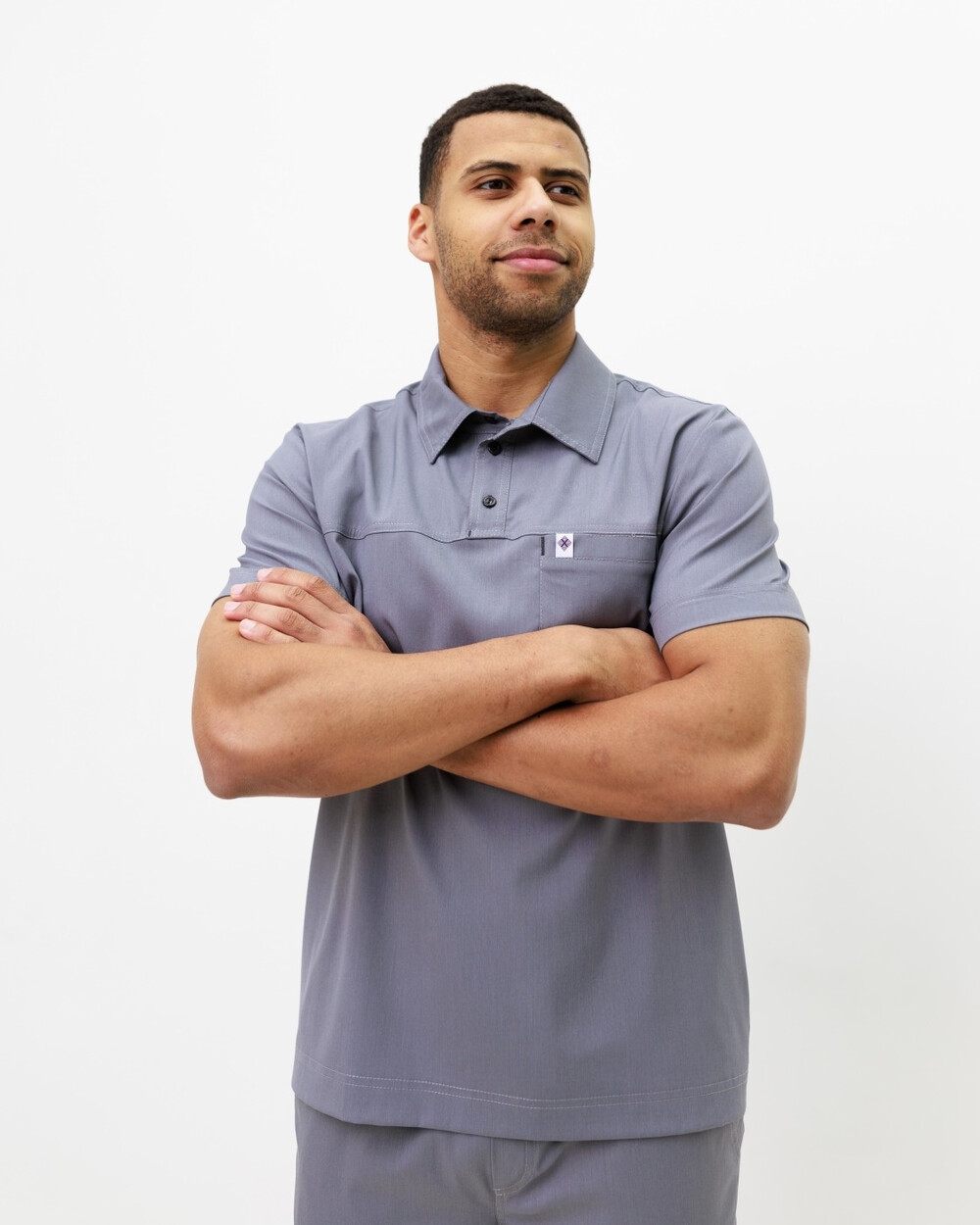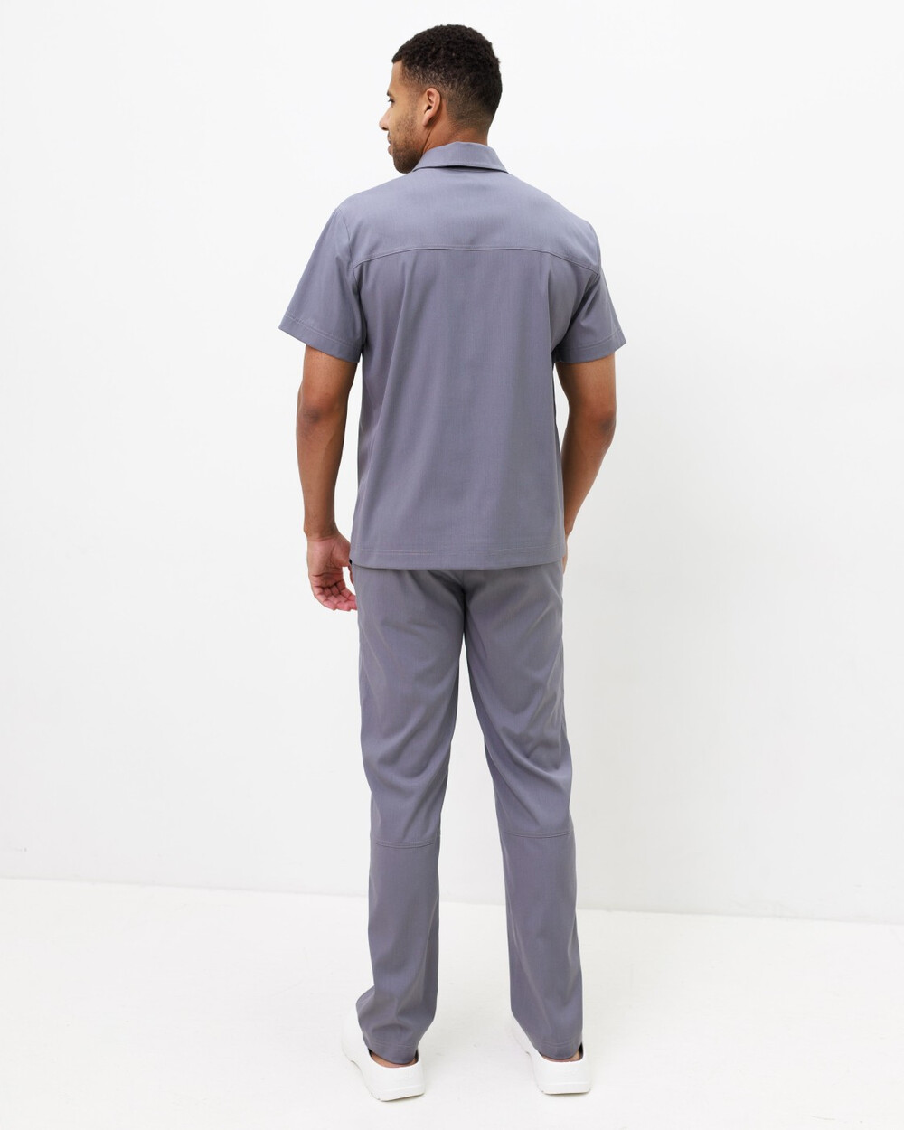 Чоловічий костюм вільного силуету. Сорочка з класичним комірцем на стійці із застібкою поло. На сорочці з лівого боку є накладна зашита кишеня, після прання вона стає функціональною. Рукави – короткі.