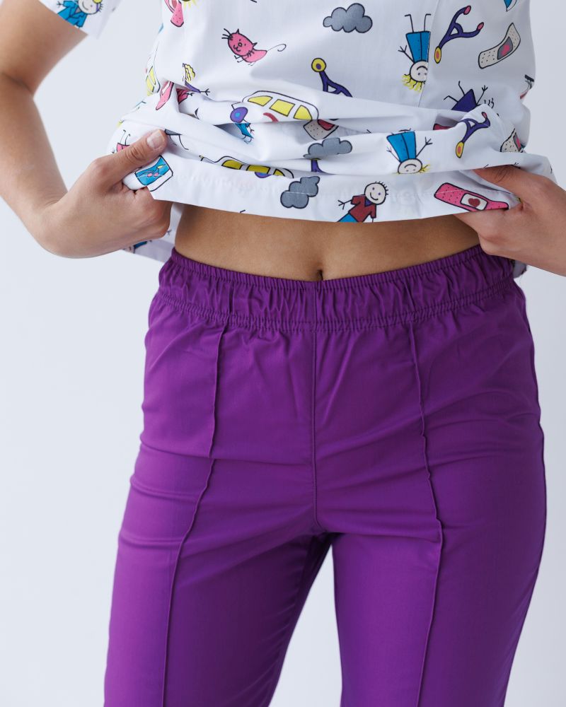 Класичний напівприталений фасон, зручний V-виріз горловини та пояс медичних штанів на еластичній гумці роблять таку уніформу оптимальним одягом для тривалих робочих буднів. Лицьова сторона сорочки доповнена кокеткою та вертикальними рельєфами, на штанах є декоративний рядок.