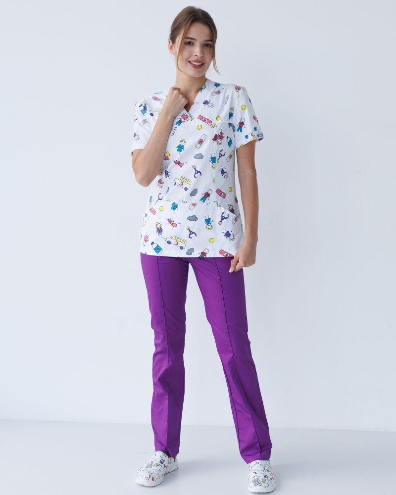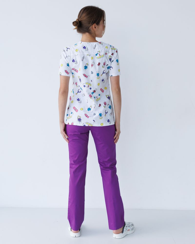 Жіночий костюм “Топаз” декорований принтом складається з медичної сорочки з короткими втачними рукавами, місткою кишенею-кенгуру та медичних штанів з вшитими кишенями.