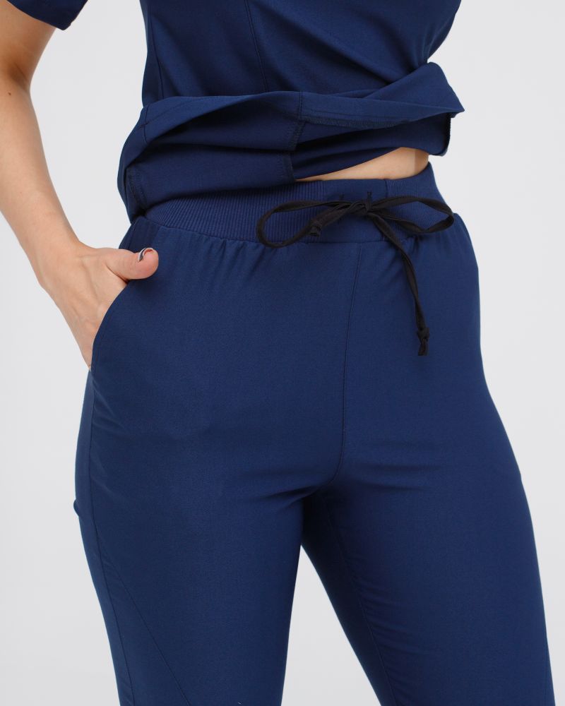 V-подібний виріз сорочки, джоггери на зручній гумці із зав'язками, зручна довжина виробів. Важлива з переваг — еластична тканина преміум сегмента, яка не меніться і тягнеться на всі боки.