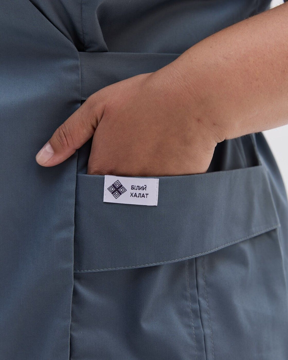 Костюм має приталений силует. Сорочка на запах, з короткими рукавами, накладними кишенями, на спинці є накладний шов. Штани мають прямий крій, кишені, пояс та розрізи з боків.