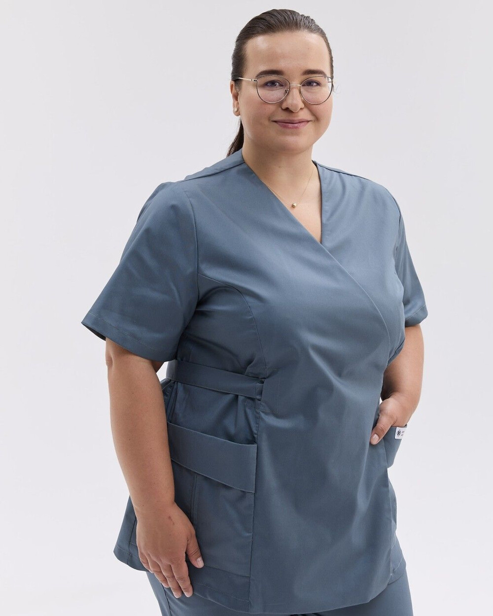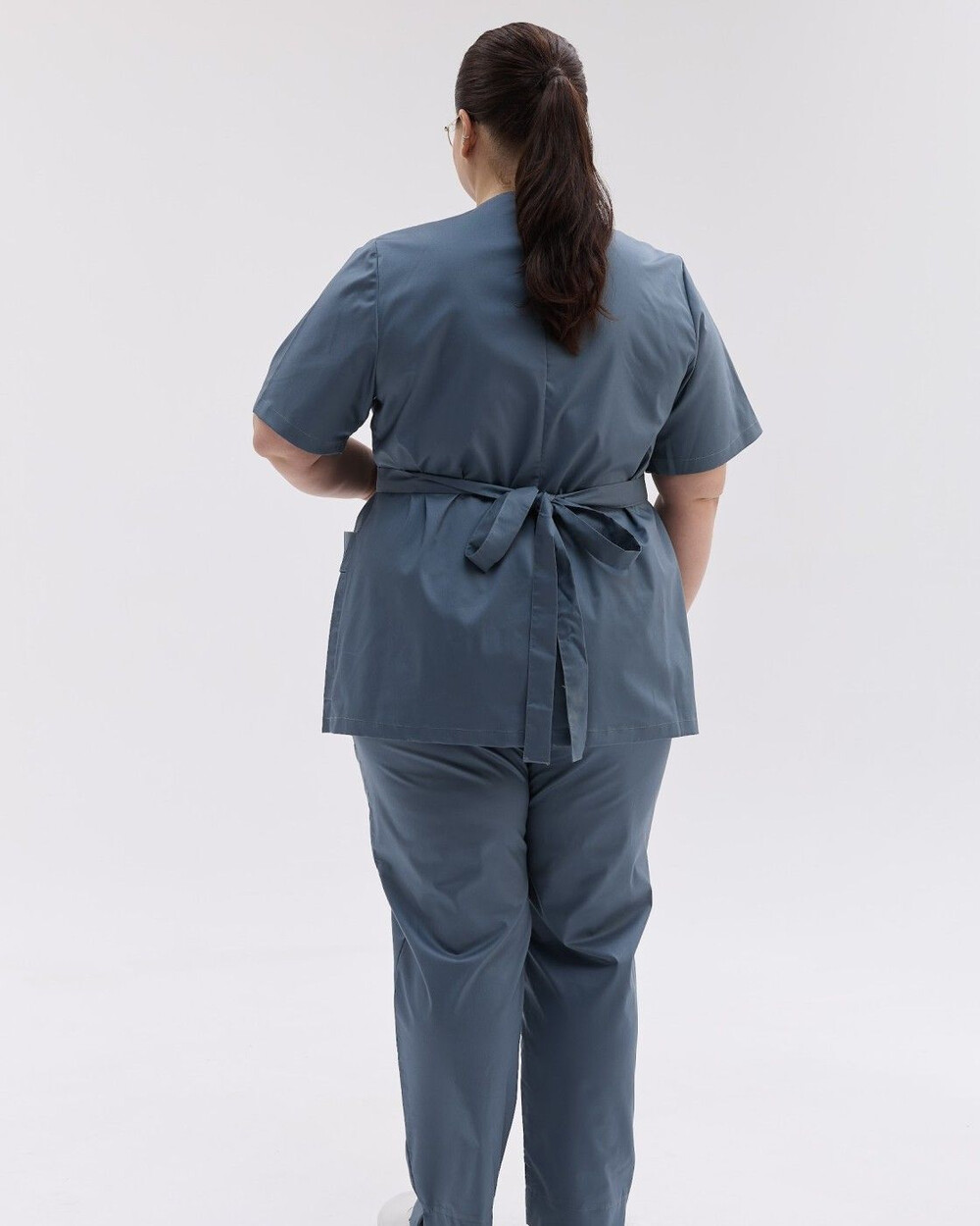 Костюм має приталений силует. Сорочка на запах, з короткими рукавами, накладними кишенями, на спинці є накладний шов. Штани мають прямий крій, кишені, пояс та розрізи з боків.