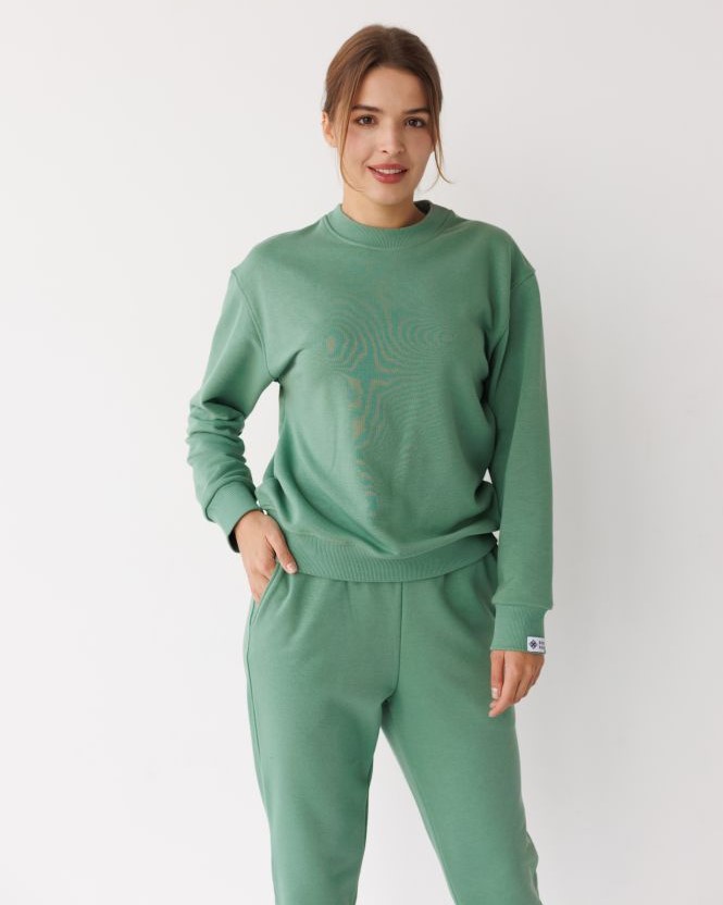 Жіночий медичний костюм Монреаль складається з медичного світшота та штанів. Жіночий костюм вільного силуету, штани з кишенями на манжетах, пояс на гумці з регулюючим шнурком; кофта з круглим вирізом, довгі рукави з опущеним плечем на манжеті, низ кофти на манжеті. На лівому рукаві пришита жакардова бирка з логотипом.