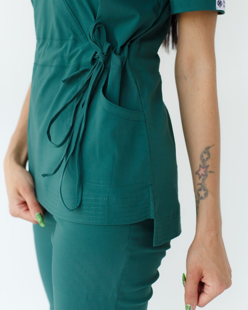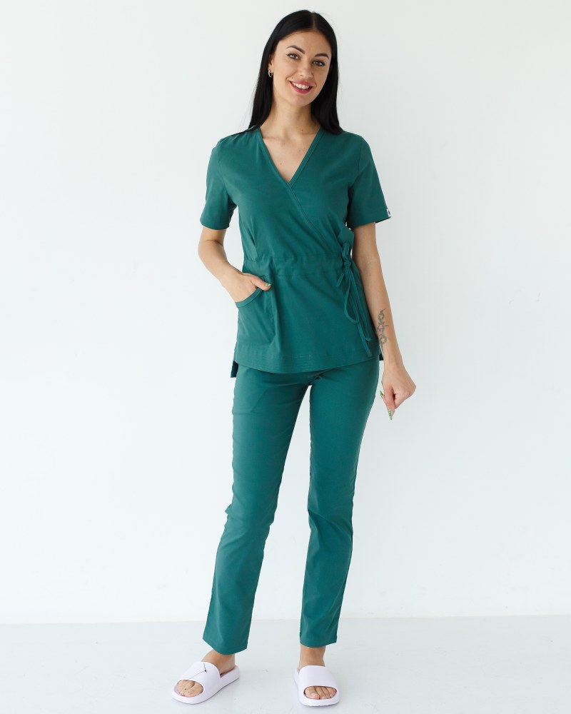 Костюм складається з медичної сорочки з коротким рукавом та звужених штанів. Сорочка з імітацією запаху має пояс-зав'язку. Такий крій наголошує на фігурі, не обмежуючи руху. Штани на еластичній гумці доповнені місткими кишенями.