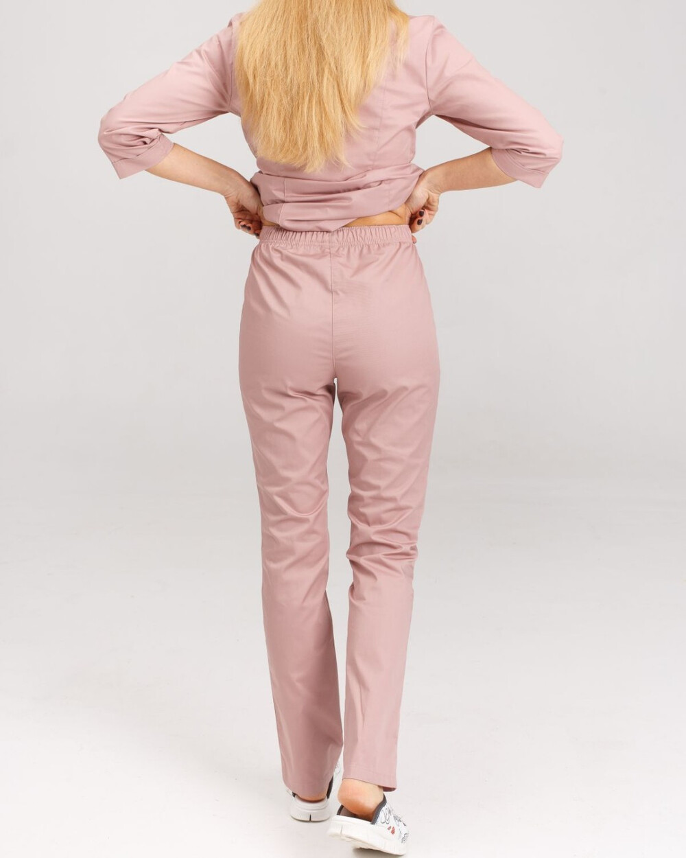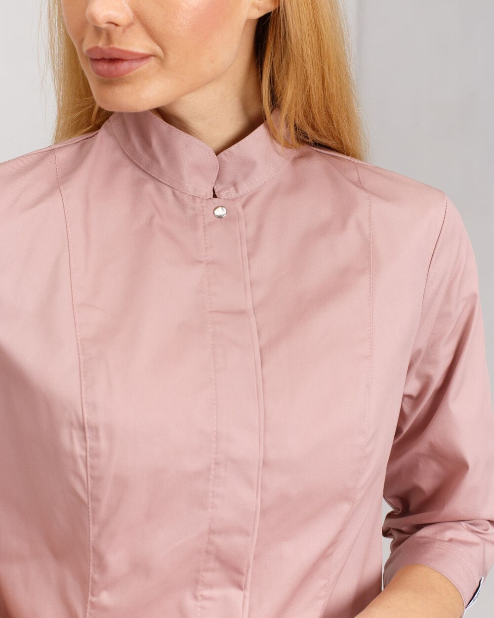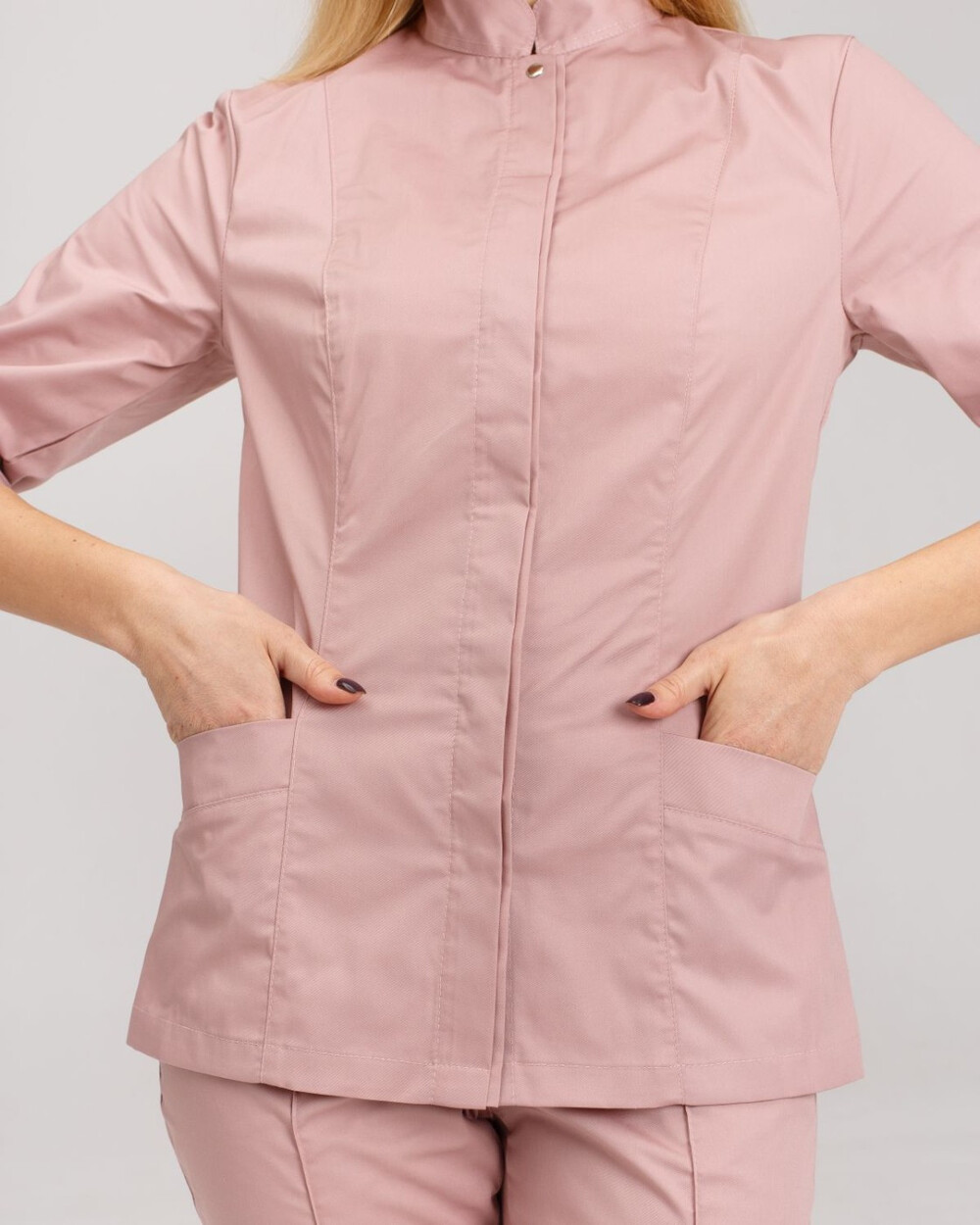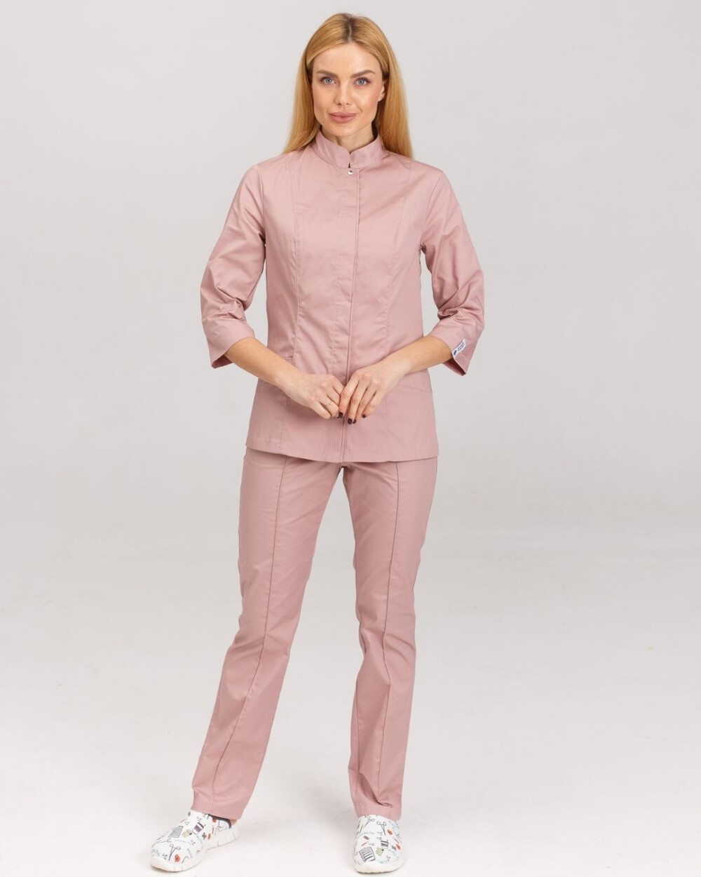 Медичний жіночий костюм «Сакура» складається з подовженої медичної сорочки та прямих штанів. Приталена сорочка на потайних кнопках із четвертим рукавом та коміром-стійкою підкреслює фігуру, не сковуючи руху. Є дві практичні втачні кишені. Сорочка доповнена контрастною декоративною вставкою біля кнопок. Штани - прямого фасону, на гумці, з декоративним рядком на лицьовій стороні.