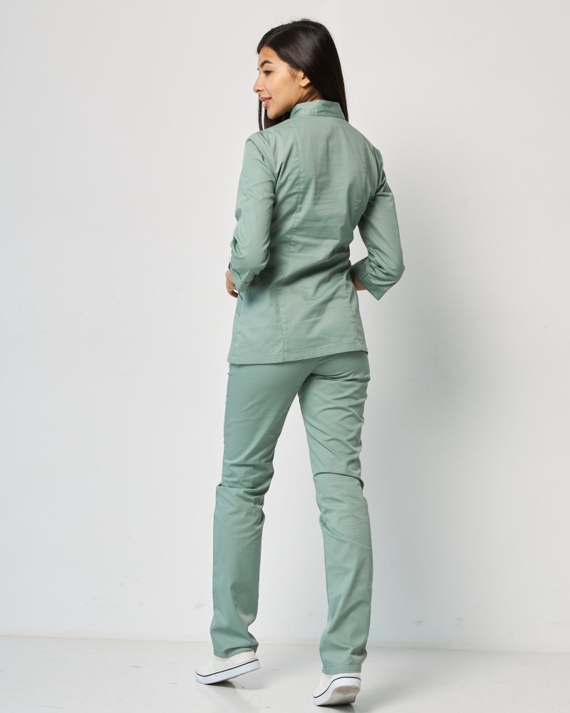 Медичний жіночий костюм «Сакура» складається з подовженої медичної сорочки та прямих штанів. Приталена сорочка на потайних кнопках із четвертим рукавом та коміром-стійкою підкреслює фігуру, не сковуючи руху. Є дві практичні втачні кишені. Сорочка доповнена контрастною декоративною вставкою біля кнопок. Штани – прямого фасону, на гумці, з декоративним рядком на лицьовій стороні.