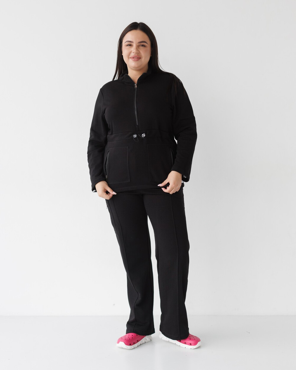 Костюм напівприлеглого силуету, виготовлений із трикотажного полотна-петлі. Кофта з довгими рукавами, стійкою коміром, застібається на блискавку, є кишені та лаштунки з гумкою та фіксатором на талії та рукавах.