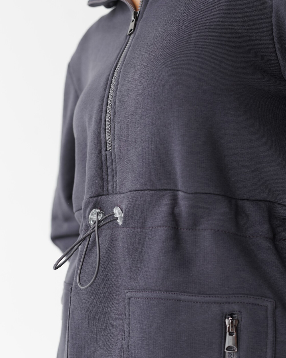 Костюм напівприлеглого силуету, виготовлений із трикотажного полотна-петлі. Кофта з довгими рукавами, стійкою коміром, застібається на блискавку, є кишені та лаштунки з гумкою та фіксатором на талії та рукавах.