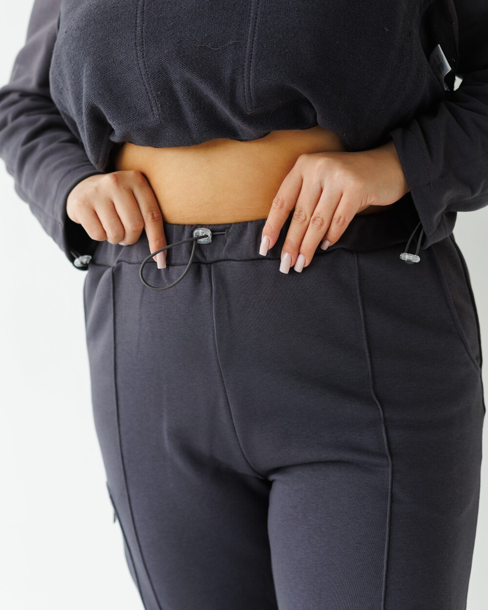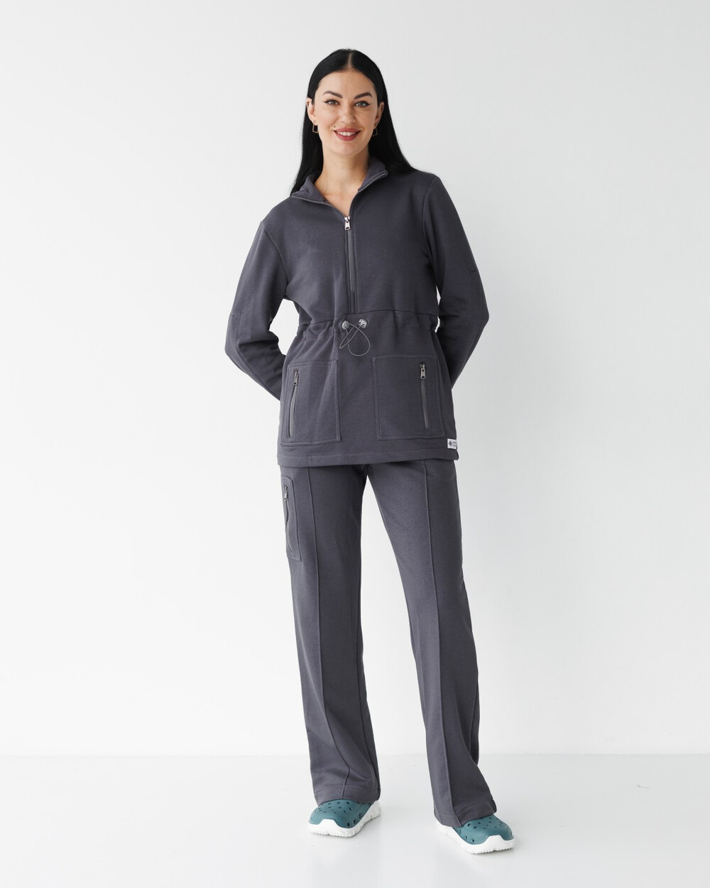 Костюм напівприлеглого силуету, виготовлений із трикотажного полотна-петлі. Кофта з довгими рукавами, стійкою коміром, застібається на блискавку, є кишені та лаштунки з гумкою та фіксатором на талії та рукавах.