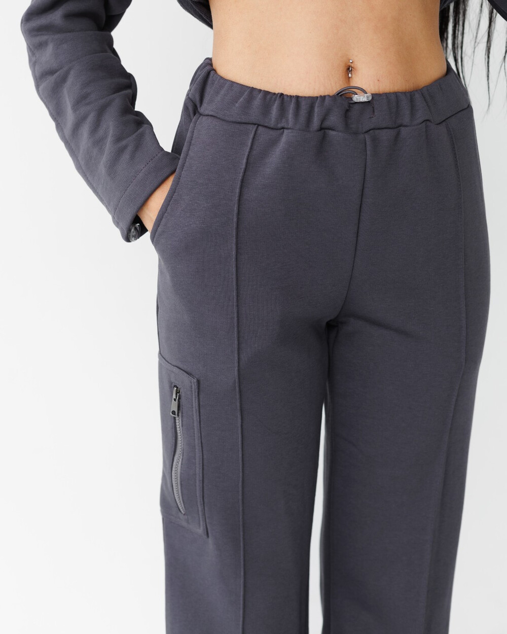 Штани довгі, прямі зі стрілками, з правого боку розташована накладна кишеня з блискавкою. Пояс пришивний, з резинкою та фіксаторами.