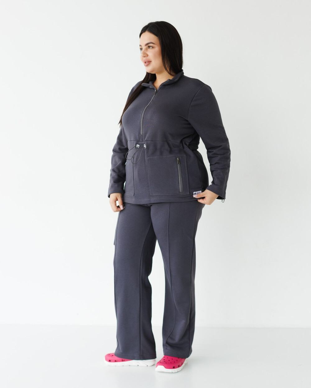 Костюм напівприлеглого силуету, виготовлений із трикотажного полотна-петлі. Кофта з довгими рукавами, стійкою коміром, застібається на блискавку, є кишені та лаштунки з гумкою та фіксатором на талії та рукавах.