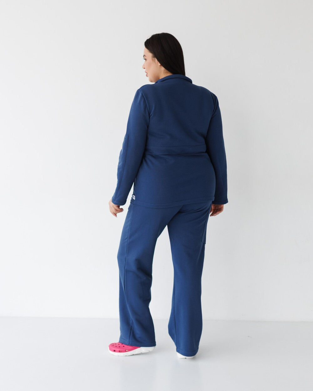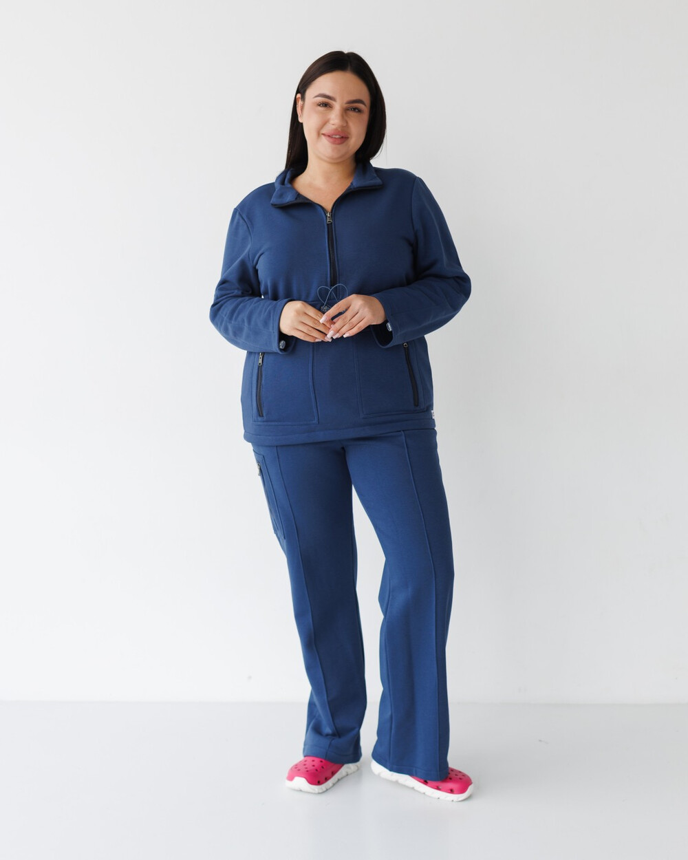 Костюм напівприлеглого силуету, виготовлений із трикотажного полотна-петлі. Кофта з довгими рукавами, стійкою коміром, застібається на блискавку, є кишені та лаштунки з гумкою та фіксатором на талії та рукавах.
