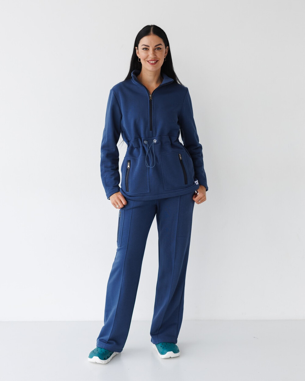 Костюм напівприлеглого силуету, виготовлений із трикотажного полотна-петлі. Кофта з довгими рукавами, стійкою коміром, застібається на блискавку, є кишені та лаштунки з гумкою та фіксатором на талії та рукавах.