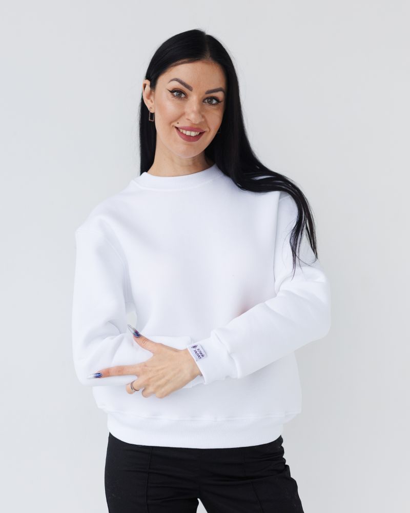 Світшот вільного силуету з круглим вирізом, довгі рукави з опущеним плечем на манжеті, низ кофти на манжеті, на лівому рукаві пришита жакардова бирка з логотипом.