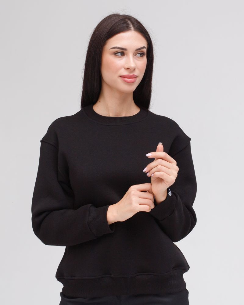 Світшот вільного силуету з круглим вирізом, довгі рукави з опущеним плечем на манжеті, низ кофти на манжеті, на лівому рукаві пришита жакардова бирка з логотипом.