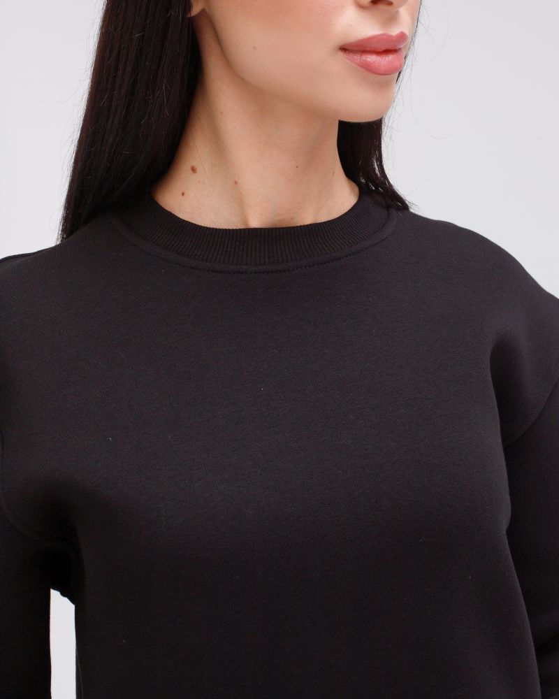 Світшот вільного силуету з круглим вирізом, довгі рукави з опущеним плечем на манжеті, низ кофти на манжеті, на лівому рукаві пришита жакардова бирка з логотипом.