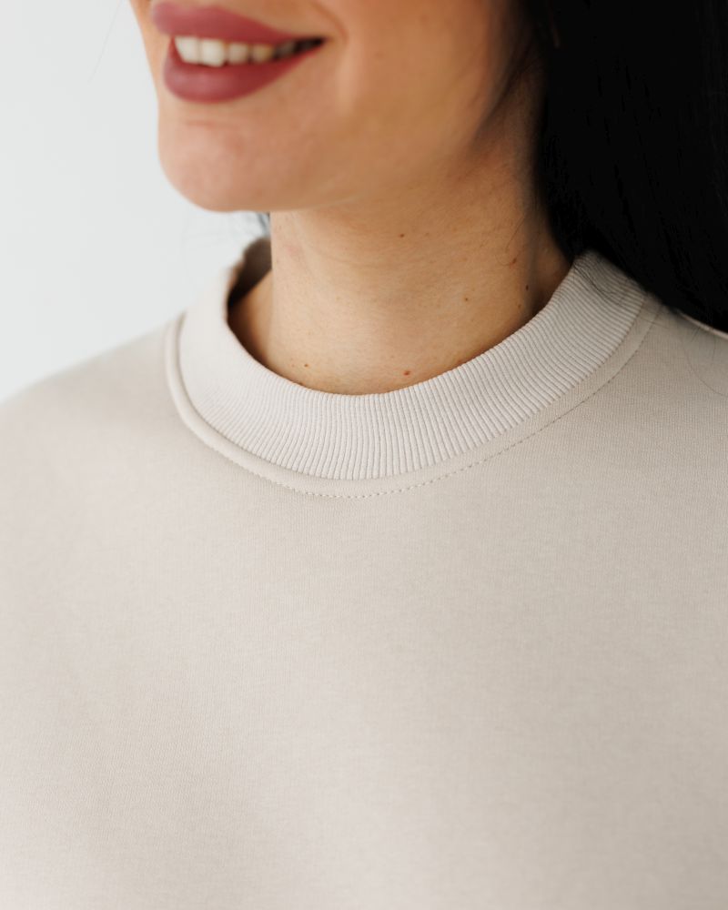 Світшот вільного силуету з круглим вирізом, довгі рукави з опущеним плечем на манжеті, низ кофти на манжеті, на лівому рукаві пришита жакардова бирка з логотипом.