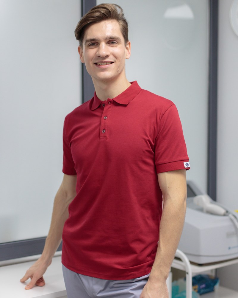 Наші медичні футболки поло для чоловіків мають напівприталений фасон. Класичний V-виріз горловини доповнений відкладним коміром на стійці та трьома гудзиками. На ваше бажання, ви можете застебнути всі гудзики, створюючи строгий робочий образ, або розстебнути їх, якщо ваш робочий гардероб має більш розслаблений стиль. Чоловіче мед поло має короткі вшиті одношовні рукави. Знизу рукави доповнені манжетками, на лівому рукаві розташувалася брендова нашивка. Низ медичного поло чоловічого оброблений плоским швом, який забезпечує зносостійкість виробу: поло не деформується після тривалого носіння, не розтягується, не втрачає форму після багаторазового прання в делікатному режимі.