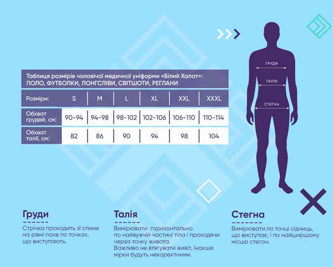 Чоловіче медичне поло чудово поєднується із чоловічими брюками, джоггерами з нашого асортименту. Медичні сабо та кросівки для медиків доповнять образ та забезпечать комфорт на весь робочий день.