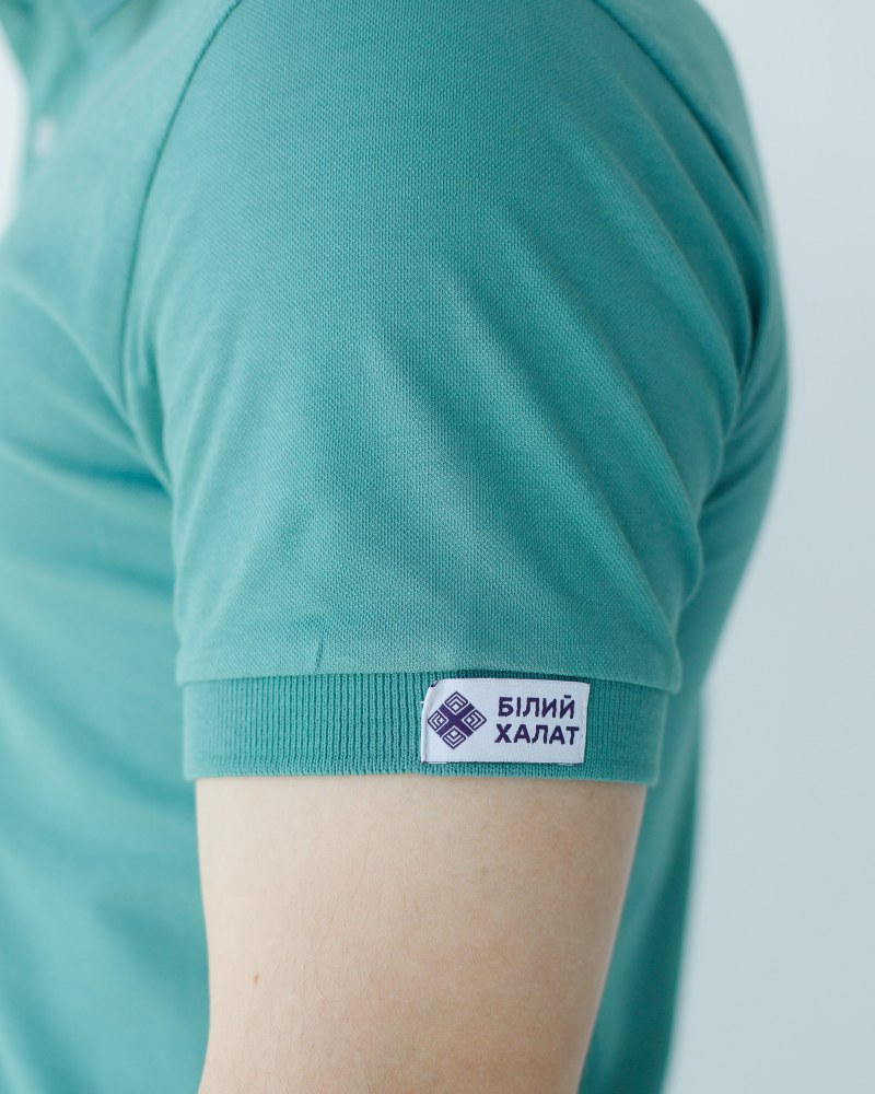 Наші медичні футболки поло для чоловіків мають напівприталений фасон. Класичний V-виріз горловини доповнений відкладним коміром на стійці та трьома гудзиками. На ваше бажання, ви можете застебнути всі гудзики, створюючи строгий робочий образ, або розстебнути їх, якщо ваш робочий гардероб має більш розслаблений стиль. Чоловіче мед поло має короткі вшиті одношовні рукави. Знизу рукави доповнені манжетками, на лівому рукаві розташувалася брендова нашивка. Низ медичного поло чоловічого оброблений плоским швом, який забезпечує зносостійкість виробу: поло не деформується після тривалого носіння, не розтягується, не втрачає форму після багаторазового прання в делікатному режимі.
