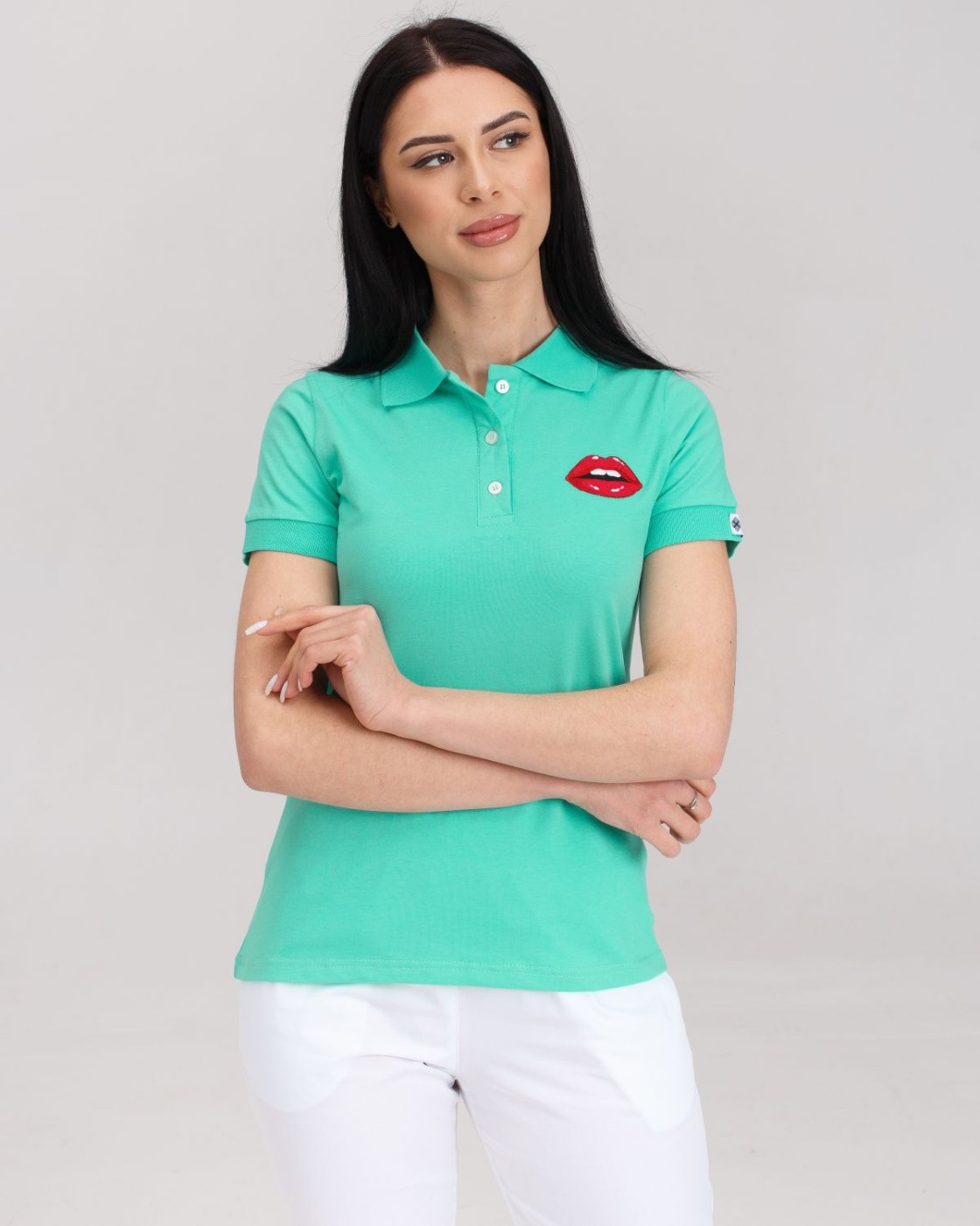 Медичне поло жіноче ментол з вишивкою Губи р. L, "БІЛИЙ ХАЛАТ" 147-441-635