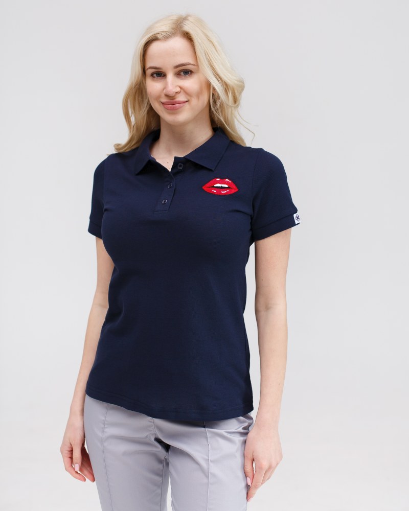 Медичне поло жіноче синє з вишивкою Губи р. S, "БІЛИЙ ХАЛАТ" 147-322-635